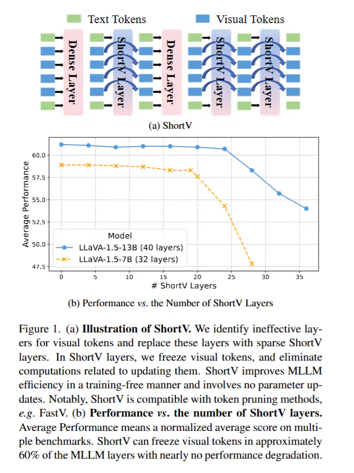 Multimodal Large Language Models (MLLMs) suffer from high computational costs due to their massive size and the large number of visual tokens. In this paper, we investigate layer-wise redundancy in MLLMs by introducing a novel metric, Layer Contribution (LC), which quantifies the impact of a layer’s transformations on visual and text tokens, respectively. The calculation of LC involves measuring the divergence in model output that results from removing the layer’s transformations on the specified tokens. Our pilot experiment reveals that many layers of MLLMs exhibit minimal contribution during the processing of visual tokens. Motivated by this observation, we propose ShortV, a training-free method that leverages LC to identify ineffective layers, and freezes visual token updates in these layers. Experiments show that ShortV can freeze visual token in approximately 60% of the MLLM layers, thereby dramatically reducing computational costs related to updating visual tokens. For example, it achieves a 50% reduction in FLOPs on LLaVA-NeXT-13B while maintaining superior performance.